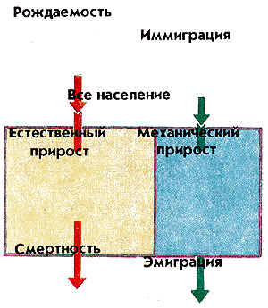 Численность населения любой территории - является результатом одновременного действия двух факторов - ЕСТЕСТВЕННОГО ПРИРОСТА (разница между количеством рождений и смертей) и МЕХАНИЧЕСКОГО ПРИРОСТА (разница между количеством иммигрантов людей, въезжающих в страну и эмигрантов - людей, выезжающих из страны). Соответственно, рождаемость и иммиграция увеличивают численность населения страны, а смертность и эмиграция уменьшают.