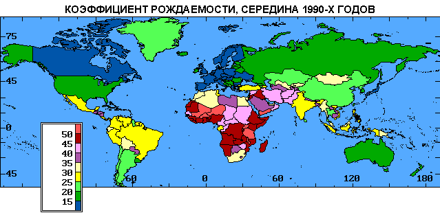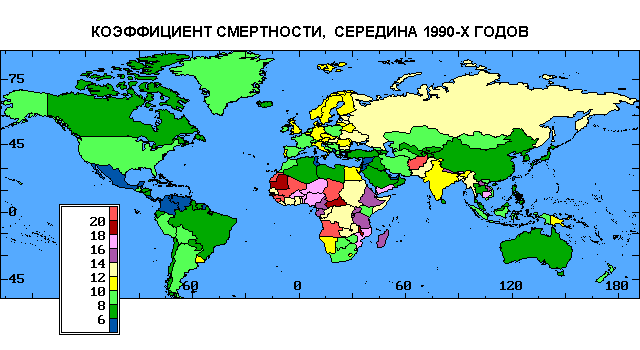 Особенно высок уровень смертности в странах Африки - ежегодно на 1000 человек умирает 13, а в некоторых странах Чаде, Западной Сахаре, Гвинее, Афганистане, Мали, Анголе - превышает 23. Коэффициент младенческой смертности (доля умерших на 1-ом году жизни) еще больше отражает разрыв между регионами и группами стран.
