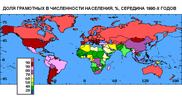 В 1990-е гг. продолжал увеличиваться разрыв между развитыми и развивающимися регионами мира по демографическим и по социально-экономическим показателям. Регионы, где отмечаются максимальные по миру коэффициенты роста населения, рождаемости, смертности (Африка, Ближний и Средний Восток, Центральная Америка) имеют самые низкие в мире показатели продолжительности жизни, грамотности и уровня жизни. Высокие показатели рождаемости, типичные для большинства развивающихся стран, являются естественной реакцией популяции на высокую смертность и низкую продолжительность жизни. Такая демографическая структура населения ведет к снижению доли ЭКОНОМИЧЕСКИ АКТИВНОГО НАСЕЛЕНИЯ (в трудоспособном возрасте от 15 до 64 лет) в общей численности населения и сокращению, таким образом, числа работников относительно количества иждивенцев; снижению уровня жизни, нехватке продовольствия. Порочный круг социально - экономических проблем начинается и заканчивается на демографии.