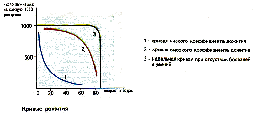 По форме кривой можно судить об общей картине продолжительности жизни и об уровне социально-экономического развития страны. Если бы не было смертей от несчастных случаев и болезней и все люди имели бы одинаковые физиологические возможности и доживали бы до 100 лет, то ИДЕАЛЬНАЯ кривая дожития имела бы форму прямоугольника. Кривые дожития для экономически развитых стран в значительно большей степени сходны по форме с идеальной кривой, чем кривые для стран, находящихся на низком уровне социально-экономического развития.