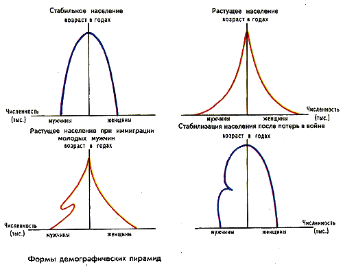 Трем типам возрастной структуры населения соответствуют разные формы возрастной пирамиды: при "молодом" населении правильная пирамида, при "стареющем" - пирамида имеет форму колокола, при "старом" - форму урны.