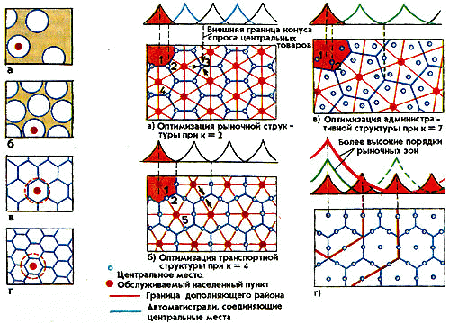 Шестиугольная (гексагональная) структура возникает в результате стремления разместить на плоскости максимально возможное количество конусов спроса. Если города размещаются в узлах решетки, это значит, что территория будет обслуживаться минимальным числом центральных мест и данное размещение будет отвечать критериям оптимизации рыночной структуры (к - число обслуживаемых населенных пунктов, т.е. само центральное место и 2 его ближайших соседа). Если города размещаются в середине ребер, то оптимальным становится транспортное сообщение между центральными местами.