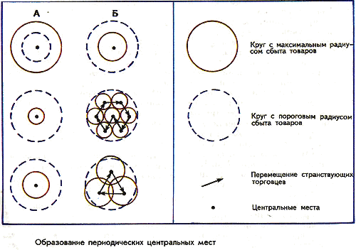 Во многих удаленных районах менее развитых в экономическом отношении стран, где плохо развита инфраструктура и существуют лишь сезонные дороги, потребители - преобладающие в структуре населения сельские жители, не могут регулярно ездить за товарами и услугами в удаленные города - постоянные центральные места. Их функции по снабжению центральными товарами и услугами выполняют разъездные торговцы. Как правило, они переезжают от деревни к деревне, вызывая к жизни широко распространенное явление как ярмарки, то есть периодические рынки. По мере роста численности и плотности населения, развития экономики, роста доходов, стандартов и уровня потребления, увеличивается общий объем торговли, а периодичность появления ярмарки в данном месте учащается.