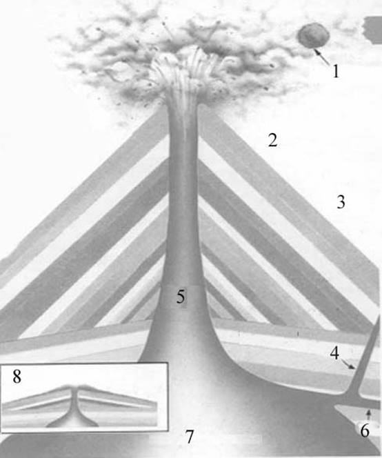 3 – слой пепла золы и лавы; 4 – дайка; 5 – жерло вулкана; 6 – силь; 7 – магматический очаг; 8 – щитовой вулкан.