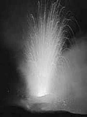 Потом под давлением газов, вырывающихся из недр земли, дно кратера взрывается. На тысячи метров выбрасываются густые черные тучи газов и паров воды, смешенных с пеплом, погружая во мрак окрестность. Одновременно со взрывом из кратера летят куски раскаленных камней, образуя гигантские снопы искр. Из черных, густых туч на землю сыплется пепел, иногда выпадают ливневые дожди, образуя потоки грязи, скатывающейся по склонам и заливающие окрестности. Блеск молний непрерывно прорезывает мрак. Вулкан грохочет и дрожит, а по жерлу его поднимется раскаленная лава. Она бурлит, переливается через край кратера и устремляется огненным потоком по склонам вулкана, уничтожая все на своем пути.