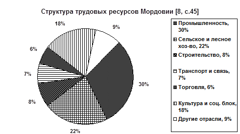 Экономические преобразования, социальная политика и тяжелое положение в промышленности благоприятствуют возрождению села и дают некоторые положительные результаты. Миграционный отток из села практически прекратился. Выросли сезонные миграционные потоки из города в село, увеличивается число фермеров и приток беженцев в село. За 1989-1993 годы численность трудовых ресурсов в Мордовии сократилась, в частности в сельском хозяйстве на 13 тысяч человек. Увеличение доли трудовых ресурсов в городах долгое время шло за счет сельских жителей. Если трудовые ресурсы в городе всегда составляли 51-56% от общей численности населения, то для сельской местности этот показатель ниже, например в 30-е составлял всего 44% годы. Современная структура трудовых ресурсов отражена на рисунке 3.1.