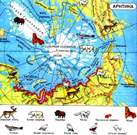 Северного Ледовитого океана. Песец, полярный волк, копытный лемминг (разновидность мыши-полевки) обитают в тундре. На отвесных скалах арктических островов селятся огромные колонии птиц.Это птичьи базары, на которых скапливаются десятки и сотни тысяч птиц. Все огромное пернатое население располагается на скале в определенном порядке. Каждый вид занимает свое место: