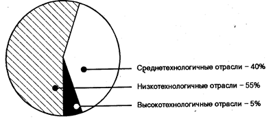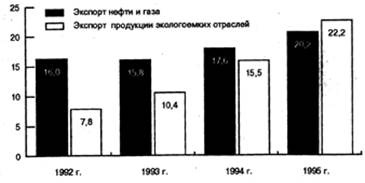 Такая специализация в действительности отражает объективные закономерности экспорта существующих избыточных факторов производства в России — нефти и газа. Однако, делая упор на экспорте ресурсов, имеющихся в избытке, государство на протяжении многих десятилетий оставляло без особого , внимания необходимость интенсивного использования избыточных факторов производства. Фактически Россия игнорировала теоретический постулат Хекшера—Олина, гласящий, что любая страна экспортирует продукты интенсивного использования избыточных факторов. Для современной международной специализации России помимо нефти и газа становится характерной и продукция некоторых других отраслей промышленности, отличающихся, как правило, низкой технологичностью и экологичностью. В их числе — черная и цветная металлургия, базовая химия, целлюлозно-бумажная промышленность. Совокупная доля этих отраслей в российском экспорте за 1992-1996 гг. выросла в 2 раза. При этом стоимость экспорта неэкологичных отраслей промышленности выше, чем совокупная стоимость вывоза нефти и газа. (рис.1).