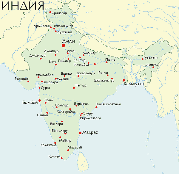 Крупнейшие города страны - Бомбей (15 миллионов жителей), Калькутта (13 миллионов), Дели (11 миллионов) и Мадрас (6 миллионов). С незапамятных времён на территорию Индии вторгались волны завоевателей и переселенцев. Самыми ранними, память о которых дошла до нас, были племена ариев. Многочисленные пришельцы постепенно проникали на юг и на восток, смешиваясь с дравидийским населением юга и тибето-бирманскими народностями, проникавшими из-за Гималаев. В результате огромное разнообразие этнических типов современной Индии. Сложившаяся кастовая система способствовала сохранению этнического разнообразия, и сегодня на улице можно встретить людей и совсем светлых, европейского вида, и темнокожих, и монголоидов. 7% населения относят к "отсталым племенам" живущим зачастую, в каменном веке. В Индии 18 официальных языков, в том числе и английский - язык делопроизводства и официальных документов. На севере страны большинство населения говорит на хинди, но все образованные люди и все, имеющие дело с туристами - работники гостиниц, ресторанов, водители такси и авторикш, продавцы магазинов и лавок, и те, кто предлагает сувениры в местах скопления туристов - говорят по-английски, а иногда, особенно в Дели, и по-русски.