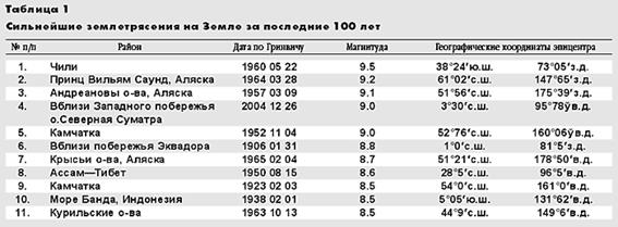 Катастрофическое землетрясение в Юго-Восточной Азии произошло в воскресенье 26 декабря 2004 г. в 0 ч 58 мин 53 с по Гринвичскому времени (7 ч 58 мин 53 с по местному), в самый разгар рождественского курортного сезона. Его эпицентр находился в Индийском океане в 250 км к западу от северной оконечности о.Суматра (Индонезия). Очаг землетрясения имел глубину около 30 км и, по всей видимости, располагался в земной коре. Расчетная магнитуда оказалась равной 9. По величине магнитуды оно заняло четвертое место среди землетрясений, зарегистрированных за всю историю инструментальных сейсмических наблюдений, начиная с 1900 г. (табл.1).