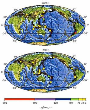 Распределение землетрясений на планете в 2000 и 2001 г г. по данным Национального центра информации о землетрясениях США (NEIC).