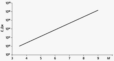 Соотношение между магнитудой (М) и энергией (Е) землетрясений.