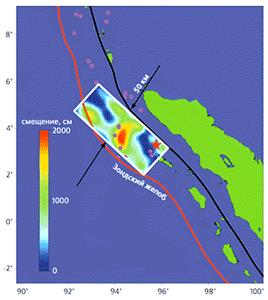 Чен Джи (Chen Ji), сотрудник Калифорнийского технологического института, проанализировал первые 200 с сейсмограмм, записанных различными сейсмическими станциями, и рассчитал распределение величин подвижек в эпицентральной зоне землетрясения. Он установил, что разрыв распространялся в северо-западном направлении, совпадающем с направлением Зондского желоба, со скоростью 2 км/с, и “оживил” его на протяжении 400 км. При этом максимальное смещение одного борта разрыва относительно другого составило 20 м. Положение зоны максимальных смещений Чен Джи связывает с наличием жесткого включения, что подтверждается возникновением вблизи северной границы разрыва пяти афтершоков, имевших магнитуды более 5. Кроме того, он отмечает совпадение положения жесткого включения с зоной поворота Зондского желоба на 30° к северу. По-видимому, для моделирования разрыва в очаге землетрясения необходимо использовать два сегмента с различным простиранием.