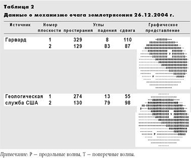 Первые определения механизма сил, действовавших в очаге произошедшего землетрясения, и подвижек блоков земной коры друг относительно друга в нем, основанные на анализе записей сейсмических волн, показали следующее. Подвижки могли произойти по двум плоскостям, одна (2) из которых крутопадающая, почти вертикальная, а другая (1) — пологая (табл.2). В табл.2 представлены решения, сделанные в двух различных научных центрах. Но их схожесть очевидна. Сейчас трудно сказать, по какой из плоскостей в действительности произошла подвижка. Для этого требуется привлечение дополнительных данных. Кроме того, тот факт, что эпицентр землетрясения находился в Индийском океане и возможные нарушения на поверхности недоступны для прямого изучения, вызывает дополнительные трудности при определении фактической плоскости разрыва.