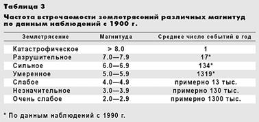Вероятно, читателя интересует вопрос о том, а как часто происходят землетрясения такой силы? Сейсмология сравнительно молодая наука. Ей чуть более 100 лет. Но она накопила уже достаточный объем данных, чтобы сделать некоторые статистические выводы. Они со всей ясностью следуют из табл.3. Однако в ней не приведены данные о повторяемости землетрясений с магнитудой более 9. Совершенно естественно, что они случаются еще реже. С 1900 г. событий с такой магнитудой на Земле зарегистрировано всего 5.