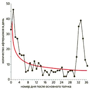 Графики зависимости числа афтершоков (слева) и их магнитуды от времени