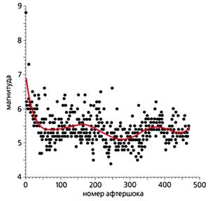 За месяц, прошедший со дня возникновения землетрясения в районе о.Суматра — Никобарские о-ва — Андаманские о-ва, было зарегистрировано около 500 повторных толчков. Самый сильный из них произошел в тот же день через 3 ч 20 мин у Никобарских о-вов и имел магнитуду 7.1, т.е. по своей энергетике был примерно в тысячу раз слабее основного толчка. Уменьшение числа афтершоков в зависимости от времени, прошедшего после основного толчка, имеет классический вид и соответствует известному закону Омори, в то же время на графике распределения величин магнитуд повторных толчков наблюдается тенденция к уменьшению магнитуды. Эти данные позволяют говорить о малой вероятности повторения такого сильного землетрясения в этом районе. Произошедший через месяц “рой” включал около сотни повторных толчков и состоял в основном из более слабых событий с магнитудами от 6.2 до 4.8, энергетика которых в тысячи раз слабее главного толчка. Они, по-видимому, завершают процесс разрушения и выделения накопленной энергии в очаге.