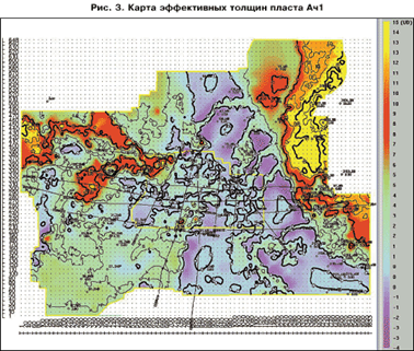 Таким образом, карта эффективных толщин для интервала Ач2, полученная по классической схеме через интервальные времена и общие толщины, была уточнена и отредактирована на локальных участках.