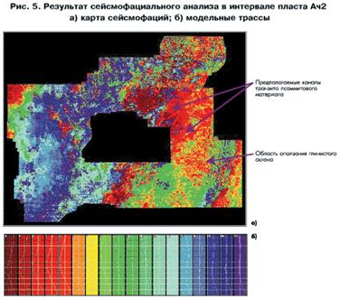 Далее спрогнозированные эффективные толщины пласта Ач2 были уточнены на локальных участках на основе атрибутного анализа — амплитуд и акустической жесткости. На многих амплитудных палеосрезах и сечениях куба псевдоакустической жесткости, сейсмофациальной карте (рис. 5), рассчитанной в пакете Stratimagic, выделяются узкие каналы выноса терригенного материала. Распределение схемы псевдоакустического импеданса (рис. 4б) было сопоставлено с картой эффективных толщин, построенной по скважинным данным в районе эксплуатационного участка. На восточной границе разбуренной части вытянутые аномалии повышенной жесткости соответствуют увеличенным эффективным толщинам по скважинам. Достаточно гладкие изолинии карты эффективных толщин, пересчитанной из карты общих толщин, были откорректированы в этой области в соответствии с поведением предполагаемых каналов выноса.