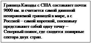 Канада граничит на юге и на западе с США. Протяженность границ (включая Аляску – 2 477 км) – 8893 км. Государственная граница очень выгодна, так как между США – высокоразвитой страной, входящей в состав “Большой восьмерки” – и Канадой существуют тесные, выгодные для Канады, торговые отношения.