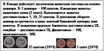 Денежная единица : канадский доллар (1 канадский доллар (Can$) = 100 центов (cents))