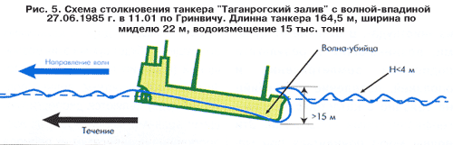 Интересно, что волны, возникающие в результате линейной фокусировки, могут быть как волнами возвышения, так и волнами-впадинами. Волны-убийцы, имеющие вид впадин, довольно часто наблюдаются в океане и представляют серьезную опасность для судов из-за трудности их своевременного обнаружения. Одна из встреч с такой волной описана в работе [13]. При вполне обычной погоде и волнении 3-4 балла танкер «Таганрогский залив» неожиданно «провалился» (рис. 5). Палуба, возвышавшаяся над уровнем спокойного моря на высоте 7 м, была залита слоем воды более двух метров. Один из матросов, работавших в это время на баке, был тяжело травмирован. Инцидент произошел у побережья Южной Африки вблизи стрежня течения Агульяс.