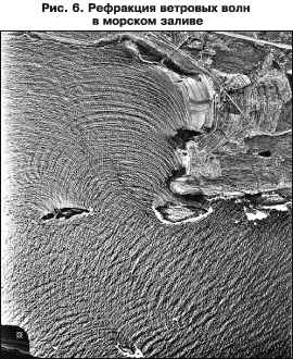 Области морских течений рассматриваются как области наиболее вероятного появления волн-убийц [14]. Неоднородности течения (равно как и неоднородности рельефа дна) могут служить своеобразными линзами, фокусирующими волновую энергию в определенных областях. Характерная картина фокусировки-дефокусировки волн прибрежными течениями и неоднородностями глубины показана на рис. 6. Такая фокусировка не повышает частоты возникновения волн-убийц, как это определяется формальным критерием (1), но она, очевидно, способна существенно увеличить абсолютные амплитуды волн, а значит, и возможные катастрофические последствия столкновения с этими волнами.