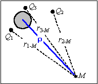 : предварительно рассчитывается положение центра (оси) "большого колодца" как центра тяжести системы скважин по их расходам, от которого и измеряется расчетное расстояние до точки