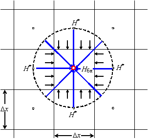 | Рис. 3. Характер притока к водозаборной скважине в РЕАЛЬНОМ (синие стрелки) фильтрационном потоке и на СЕТОЧНОЙ МОДЕЛИ (черные стрелки) |