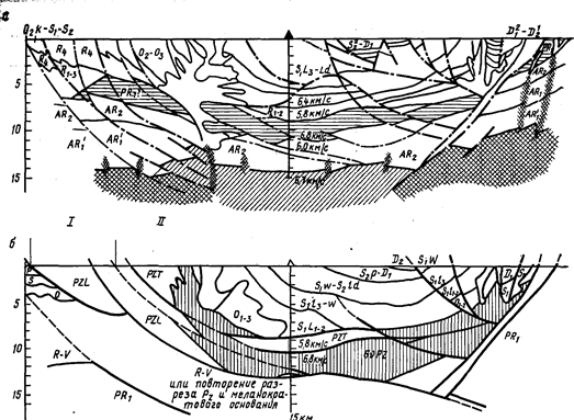 На таком фоне по-новому выглядит проблема выделения по сейсмическим данным геологически значимых разломов и контактовых поверхностей разных толш и комплексов. Наиболее крупные выдержанные по распространенности структурно-вещественные мегакомплексы коры удается выделять и прослеживать достаточно уверенно только по совокупности данных, прежде всего, о скоростных параметрах среды, положению в общем разрезе коры, с учетом данных по отражающим элементам и геологии поверхности, поскольку, как показал выполненный анализ всей системы профилей ГСЗ по Уралу, такие мегакомплексы характеризуются выдержанностью скоростных характеристик и их типовых вариаций . Оппоненты обычно указывают на различные неоднозначности вследствие влияния на физические параметры в коре вариаций давлений, напряженного состояния, флюидного режима и других трудно учитываемых факторов. Подобное влияние имеет место в частностях, но в целом интегральные скоростные характеристики крупных распространенных на больших площадях единиц разреза определяются надежно, а их латеральные вариации закономерно согласуются с особенностями геологии поверхности.