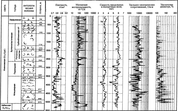 Высокоскоростные целики чередуются с интервалами с резко пониженными скоростями упругих волн и плотностей, видимо, зонами мелкой трешиноватости. Визуально в керне они невыразительны, не имеют ясных границ и выделяются не всегда или неполно. Такие зоны наиболее выражены в интервалах 560—650;1800; 1850—1920; 2600—2750 м. Геологами некрупные, без милонитов, тектонические нарушения и зоны трещиноватости зафиксированы на глубинах 560—580; 1800; 2500—2510; 3480;3560 м. Предельно низкие Vp до 5,6 км/с присущи интервалам (3600—4300 м и др.), сложенным туфам и тефроидами кислого состава с плотностами около 2,75 г/см , вполне соответствующими составу пород и их скоростным характеристикам. Но на более поздних данных ВСП эта часть разреза по скоростям не выделилась.
