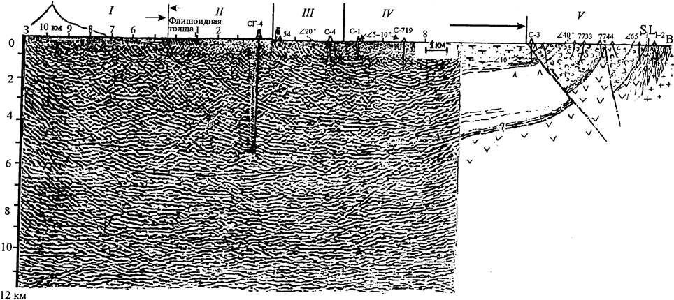 При сопоставлении вскрытого скважиной разреза с результатами наземных сейсмических исследований устанавливается, что практически все зафиксированные вдоль оси скважины отражающие площадки (на глубинах 600, 1500, 2500, 2900, 3500 м) отвечают отмеченным выше крупным зонам тектонических нарушений и повышенной трещиноватости. При этом последняя из площадок совпадает с кровлей флишоидной толщи. Выявляется, что сейсморазведка, чутко реагируя на разрывные дислокации и физическое состояние пород, слабо улавливает изменения в литологии разреза. Ответ на вопрос, что собой представляют установленные ниже по разрезу отражающие поверхности, можно получить только при дальнейшем углублении скважины. В этом плане показательно высказывание президента Международной программы «Литосфера» К. Фукса: «У нас есть тысячи километров профилей сейсмического отражения, но мы не знаем, что они показывают».