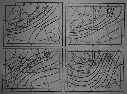 Изменчивость погоды во времени определяется относительным расположением областей повышенного и пониженного давления воздуха. В самых грубых чертах известно, например, что зимой области высокого давления совпадают с областями пониженных температур подстилающих поверхностей. В этих областях воздух характерен своей сухостью, наблюдается малая облачность и т.д. Области низкого давления воздуха совпадают с областями повышенных температур воздуха, повышенной влажностью и облачностью и т.д.