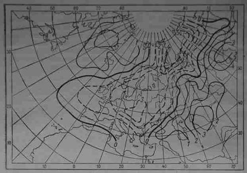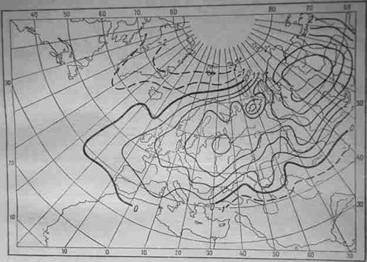 Вероятные величины отклонений температуры от нормы при меридиональном типе циркуляции зимой.
