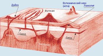 Фактически ядром многих горных образований являются батолиты. Шток аналогичен батолиту, но значительно меньше по размеру. Когда магма пробивает себе путь между горными породами, она образует пластовые структуры (силл). Лакколит в форме гриба образуется тогда, когда магма давит на вышележащие пласты породы. Когда магма прорывается сквозь существующие пласты под углом, образуются дайки.