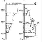 Если в скважине имеется раздел нефть–вода, то четко отмечается рост приращения при переходе от воды к нефти. Если этот раздел располагается в той части скважины, где нет движения жидкости, то при переходе от воды к нефти должно наблюдаться изменение приращения от ΔТ 0В до ΔТ 0Н . Если в воде значение приращения температуры отличается от ΔТ 0В , то это служит надежным признаком движения жидкости по скважине и наличия притока в нижней части скважины.