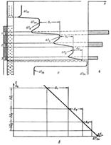На Рис. 4, б изображена схематическая дебитограмма, полученная термодебитомером. При переходе через интервал, на котором в скважину поступает жидкость, следовательно, изменяется скорость движения потока, за счет изменения теплообмена изменяется сопротивление чувствительного элемента. По этому изменению и выделяют отдающий интервал. Вследствие более сильного влияния потока жидкости, перпендикулярного к оси прибора (радиального потока), по сравнению с потоком вдоль оси скважины в кровле отдающих жидкость интервалов (но не всегда) наблюдается минимум, выше которого отмечается некоторый рост показаний. Подошва интервала поступления жидкости в скважину отмечается по началу спада кривой (при движении прибора снизу вверх), а кровля – по минимуму или (при его отсутствии) по точке перегиба кривой. Количественное определение дебита проводят по разнице δТ между показаниями ΔТ ниже интервала и выше интервала притока (после прохождения указанного выше переходного участка непосредственно после минимума). Переход от значений δТ к дебиту осущестляют по градуировочной кривой. Поскольку теплопроводность нефти, газа и воды различна, приращение сопротивления для трех сред при одной и той же скорости потока различна. Поэтому эталонировочная кривая должна быть получена для каждой из этих сред. Из-за различия теплопроводности сред термодебитомер показывает изменение показаний при переходе через раздел вода – нефть или вода – газ. Аналогично производят построение интегрального и дифференциального профилей по данным механической расходометрии. Интегральный профиль притока может быть описан формулой: