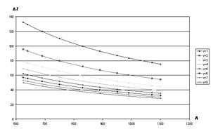 На основании полученных зависимостей можно сделать вывод о том, что кривую на определенных участках можно аппроксимировать прямой линией, это может во многом упростить решаемую задачу. При скоростях флюида близких к нулю превышается предел чувствительности дебитомера, приведенный технической характеристике выше. При нулевой скорости существует приращение температуры ΔТ 0 , являющееся максимальным. А с возрастанием скорости величина ΔТ уменьшается, что видно из рисунков 10, 11, 12.