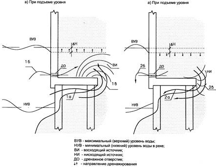 Рис.2.5 Схемы фильтрационного механизма разрушения грунтового основания при изменении уровня воды в реке