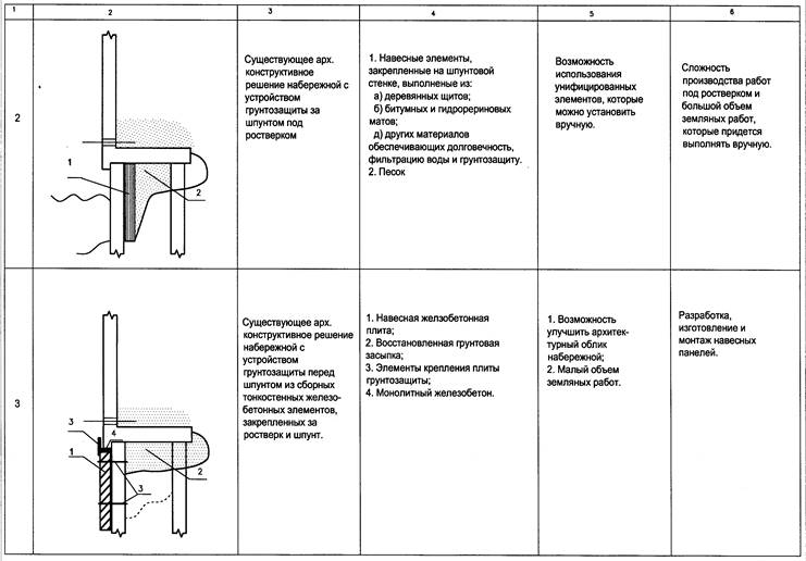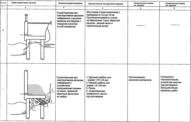В таблице 2.1 предложены 7 вариантов восстановления набережной р. Омь с устройством грунтозащиты за шпунтом под ростверком, грунтозащиты перед шпунтом из сборных ж/б элементов, заделкой прозоров в шпунте со стороны акватории вяжущими полимерами, устройством заднего грунтозащитного экрана, шпунтом, навешанным на ростверк и грунтозащитным экраном парусного типа (рис.1-7). На рис.0 таблицы 2.1 дано существующее конструктивное решение набережной с высоким ростверком.
