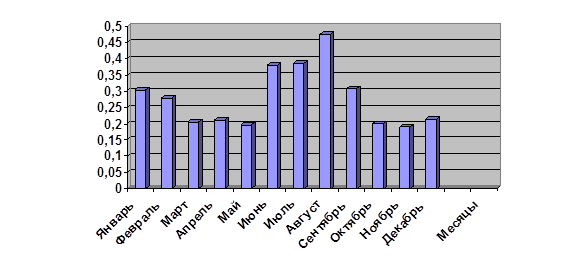 График изменения МПЗА за год показывает, что наибольшее значения наблюдаются в июне, июле, августе, сентябрь, а так же в январе, феврале. Это можно пояснить температурными инверсиями в зимний период, слабыми туманами, ветрами. График показывает, что на данной территории наблюдаются благоприятные условия для рассеивания загрязняющих веществ.