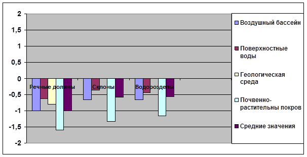 Наименее устойчивы к техногенным нагрузкам территории безлесные урочища речных долин, т.к. они характеризуются высокой эрозионной активностью и неустойчивостью почв к размыву, довольная высокой степенью загрязнения поверхностных вот и застойным режимом воздушных массами.