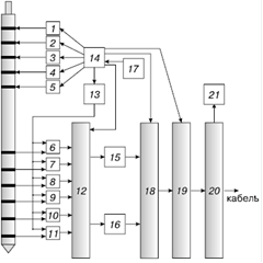 Электронная схема содержит: усилители мощности – 1-5; смесители – 6-11; аналоговый коммутатор – 12; перестраиваемый гетеродин – 13; устройство управления скважинным прибором – 14; усилители промежуточной частоты – 15, 16; опорный кварцевый генератор – 17; широкополосный фазометр – 18; передатчик телесистемы – 19; выходное устройство – 20; блок питания – 21.