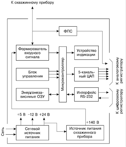 Энергонезависимое ОЗУ обеспечивает хранение значений «нулей воздуха» скважинного прибора, которые учитываются при каждом измерении.
