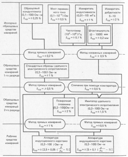 Особенности передачи единиц геофизических величин состоят в том, что, с одной стороны, практически отсутствуют государственные эталоны, воспроизводящие единицу измерения, а с другой – предъявляются высокие требования к точности рабочих СИ. Данные обстоятельства делают необходимым создание специальных калибровочных схем, имеющих в своей основе исходные образцовые СИ, аттестованные методом косвенных измерений, что диктуется необходимостью обеспечения требуемой достоверности и точности ГИС. В общем случае максимальная точность передачи размера единицы рабочим СИ была достигнута при непосредственной их поверке по исходному образцовому СИ. Однако подобная технология передачи размера единицы неприемлема, так как рабочие СИ ГИС эксплуатируются во многих предприятиях, территориально удалённых друг от друга и от места базирования исходного образцового СИ. Поэтому в поверочную схема вводят промежуточную ступень передачи размера единицы – образцовые СИ, размещаемые в крупных производственных предприятиях. При этом метрологические характеристики образцовых средств должны быть установлены таким образом, чтобы выполнялись соотношения: