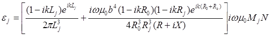 Здесь L1 и L2 – расстояния от имитирующих катушек И1 и И2 до генераторной катушки Г, b – радиус кольца, z – расстояние от плоскости кольца до измерительной катушки И1, ток в генераторной катушке изменяется по закону J = J 0 ∙ eiωt . Рабочая частота зонда ƒ = ω /2 π . Комплексное сопротивление цепи кольца на рабочей частоте R + iX . Активное сопротивление R складывается из потерь в высокоомном проводе и в конденсаторе, включённом в разрыв цепи. Реактивное сопротивление X = 1/ ωC – ωL . В этом случае ЭДС, наводимая в j -ой измерительной катушке, равна: