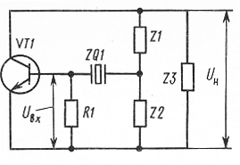 Рассмотрим схему автогенератора, в которой кварцевый резонатор используют в качестве последовательного контура. Транзисторный автогенератор с кварцевым резонатором собран по трёхточечной схеме (рис. 6.6). В цепь обратной связи включён делитель, состоящий из кварцевого резонатора с полным сопротивлением ZQ1 и резонатора R1. Колебательная система выполнена из двух контуров: нагрузки коллектора Z1, Z2 и Z3 и цепи обратной связи R1, ZQ1 и Z2. Работа схемы основана на том, что сопротивление резонатора ZQ1 минимально на частоте последовательного резонанса ωКВ и резко увеличивается при отклонении от неё. В результате этого самовозбуждение возможно только в узкой области частот. При правильном выборе параметров добротность контура цепи обратной связи близка добротности кварцевого резонатора и значительно выше добротности коллекторного контура. Добротность колебательного контура - характеристика резонансных свойств системы, показывающая, во сколько раз амплитуда вынужденных колебаний при резонансе превышает амплитуду при его отсутствии. Чем выше добротность колебательной системы, тем меньше потери энергии в ней за период. Добротность колебательного контура: