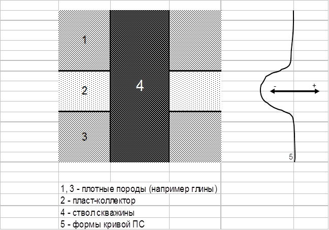 В скважине отсутствие непосредственного контакта растворов одного состава различной концентрации, наличие тонкопористых перегородок, различие в составах растворов и наложение других потенциалов усложняют общую картину. Схематическое изображение поля самопроизвольной поляризации в скважинных условиях показано на рисунке: