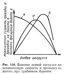 Частота вращения долота п в турбинном бурении переменна и зависит от количества бурового раствора и осевой нагрузки на долото, т. е.