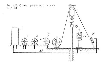 Схема РПДЭ-3 показана на рис.3. Осевая нагрузка на долото измеряется с помощью электрического датчика 6 и передается на пульт управления 5, где сравнивается с величиной Ро, задаваемой бурильщиком. Разность сигналов АР поступает на усилители, установленные в станции управления 1. Усилители действуют на обмотку возбуждения мотор-генератора 2, вращаемого асинхронным электродвигателем, питающимся от системы электроснабжения буровой, Генератор 2 питает двигатель постоянного тока 3, установленный на приводе редуктора 4 и соединенный через цепную передачу муфты с подъемным валом лебедки.